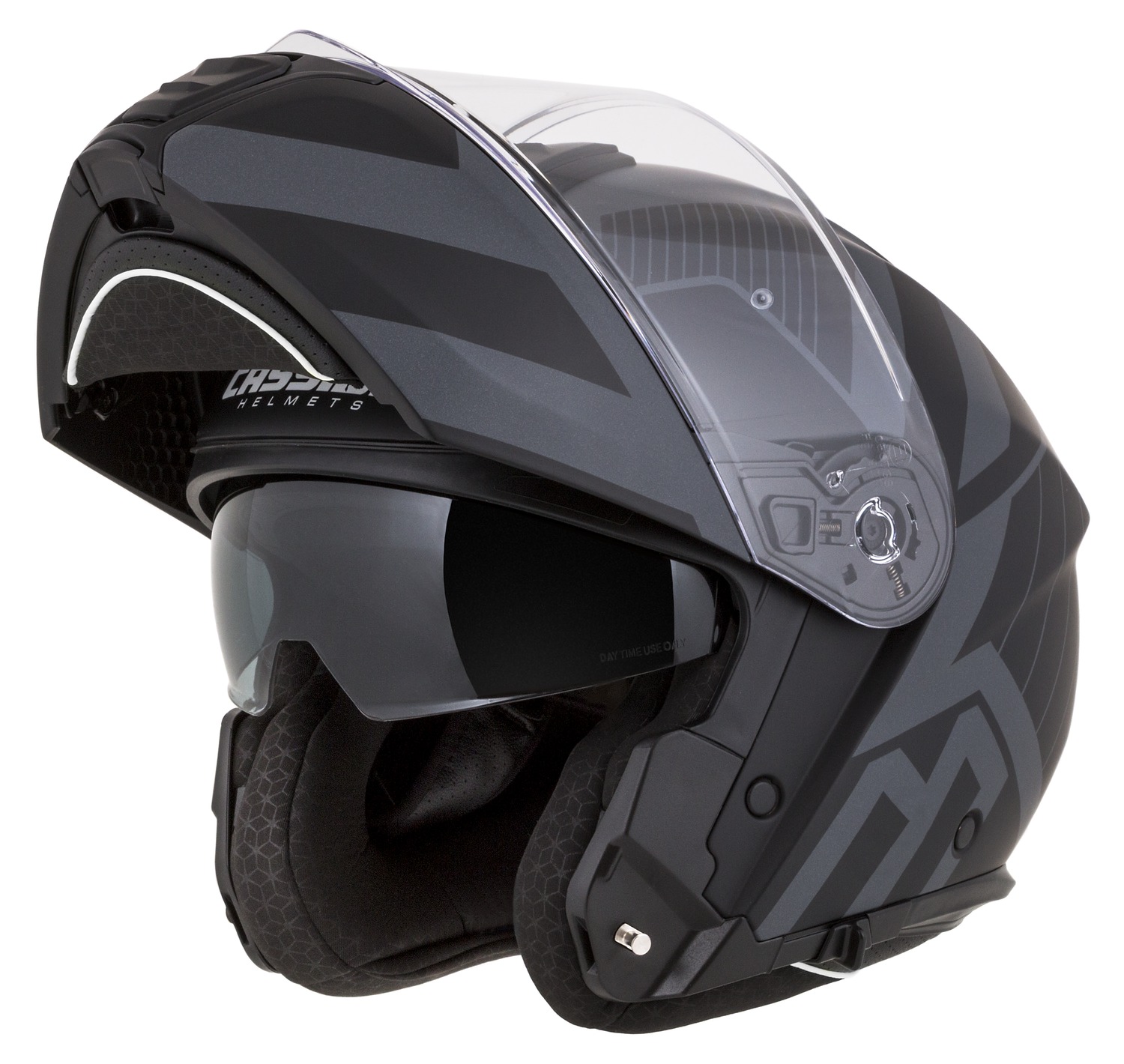 Dvojitá homologácia ECE 22.06.P/J pre otvorenú a integrálnu prilbu s možnosťou fixácie výklopnej časti vo vyklopenej polohe.
