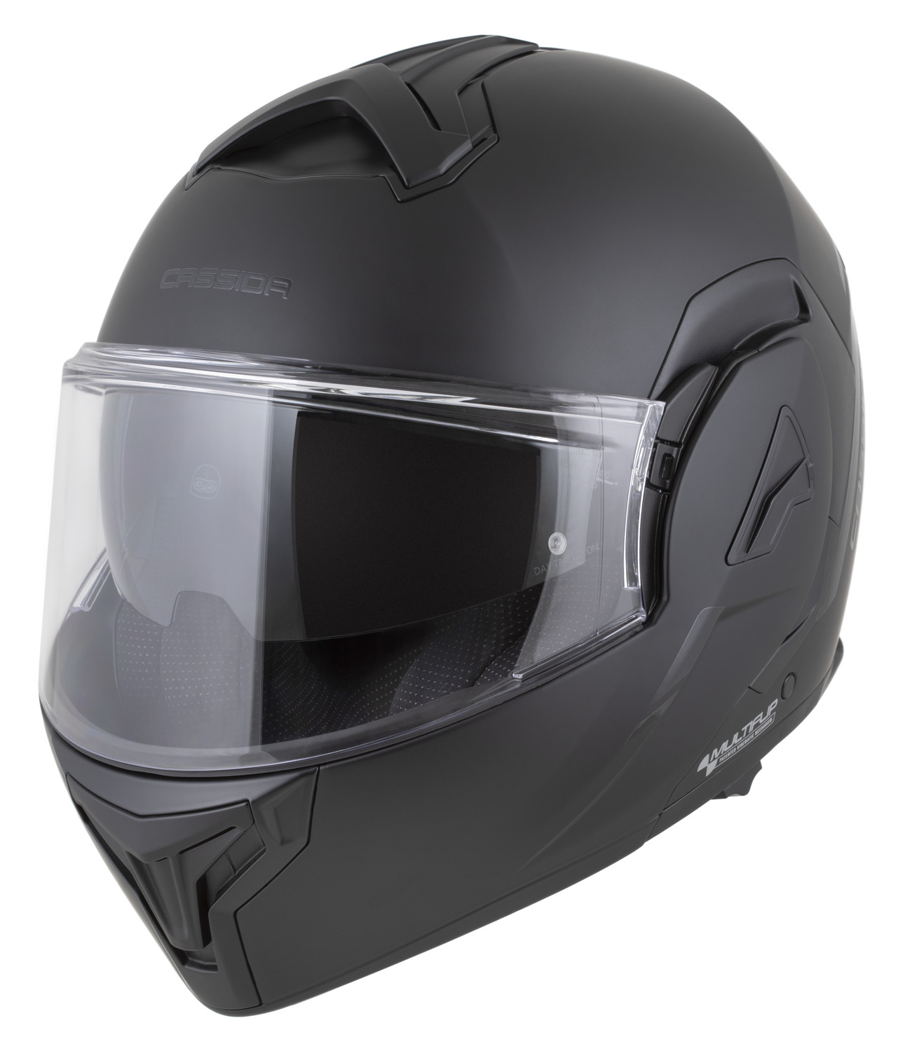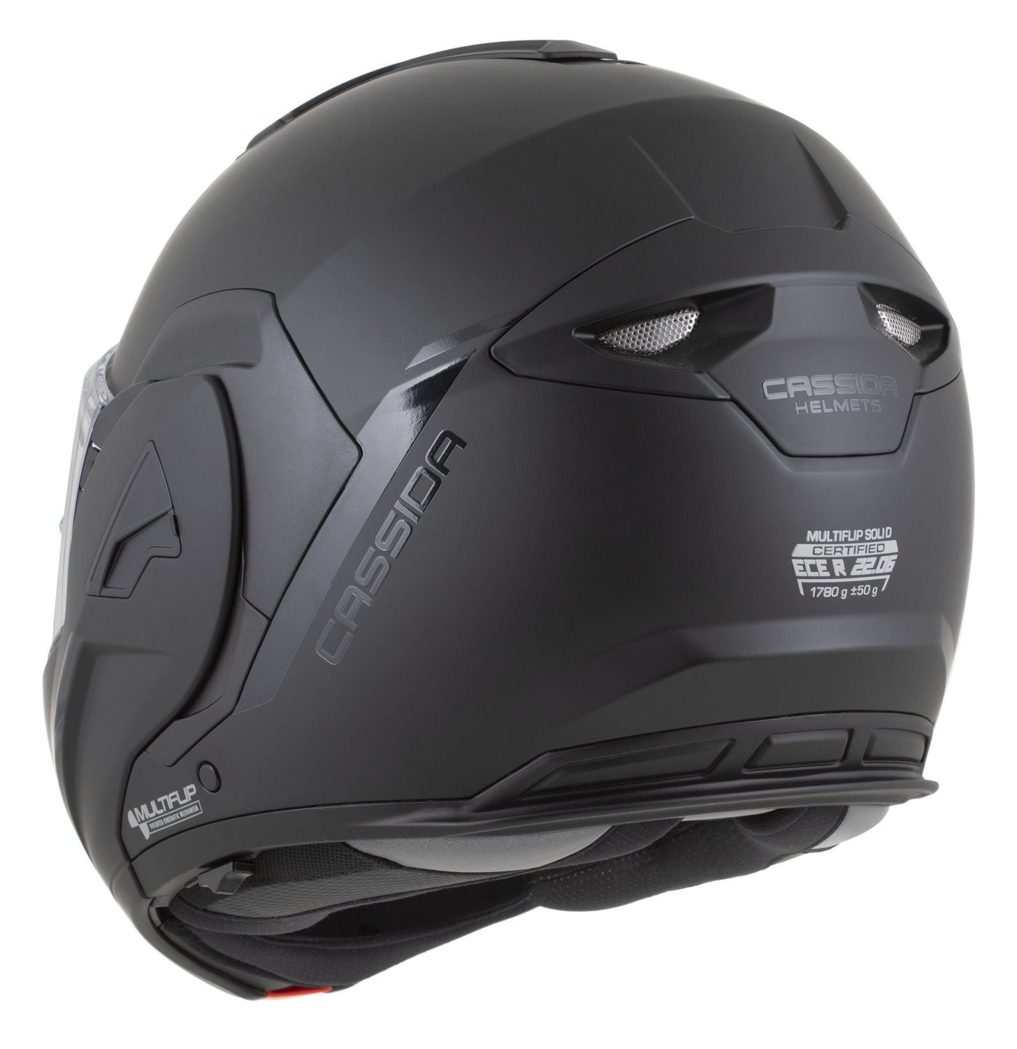 Dvojitá homologácia ECE 22.06.P/J pre otvorenú a integrálnu prilbu s možnosťou fixácie výklopnej časti vo vyklopenej polohe pomocou poistky.
